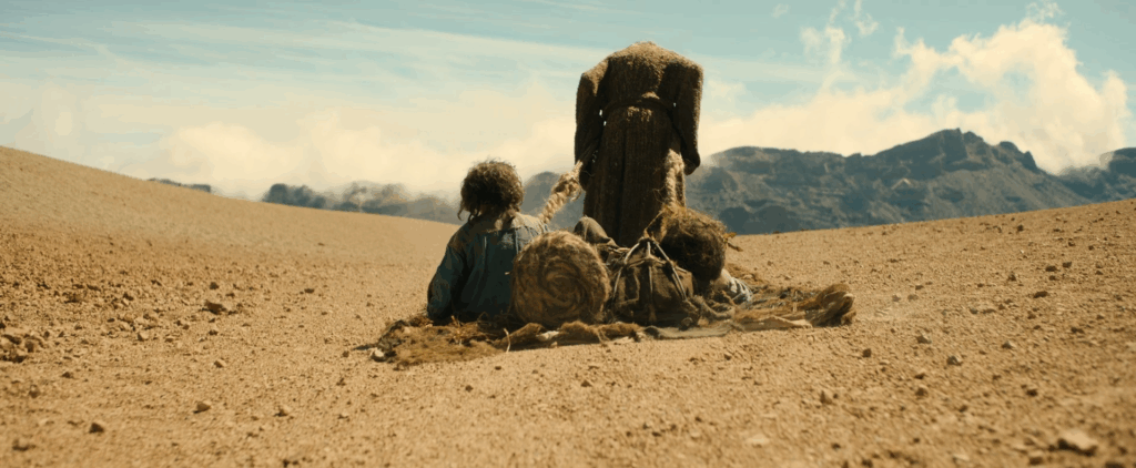 Als der Fremde aka Gandalf die beiden Hobbits Nori und Poppy durch die Gegend schleift. (Rings of Power: S02/E02)